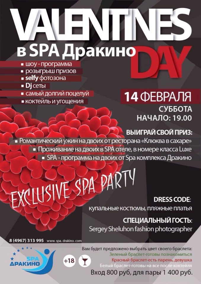 Вход всего 800 руб. чел, либо 1400 руб. с пары. Вас ждет вечеринка в бассейне, развлечения, возможность выиграть отличные призы и профессиональные фото!