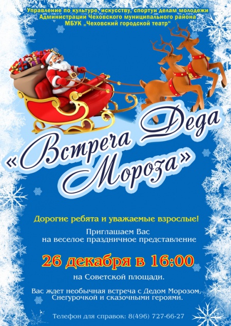 Дорогие ребята и уважаемые взрослые! Приглашаем Вас на веселое праздничное представление! Вас ждет необычная встреча с Дедом Морозом, Снегурочкой и сказочными героями!